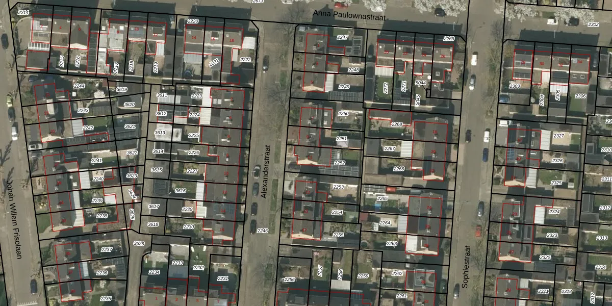 Gebruik de zoekbalk of klik op een perceel voor informatie over de adressen binnen dit perceel.
