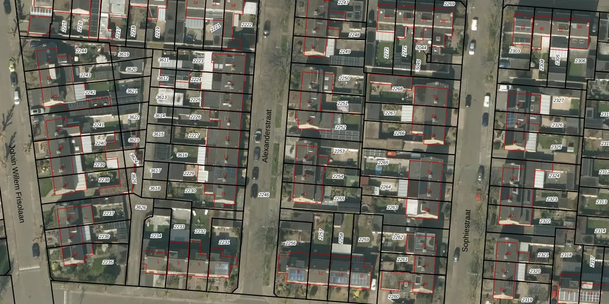 Gebruik de zoekbalk of klik op een perceel voor informatie over de adressen binnen dit perceel.