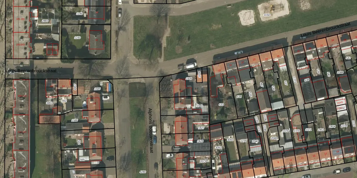 Het perceel waarop Alphons Boostenstraat 15 staat heeft een oppervlakte van 349 m². Dit is een groot perceel. De perceeloppervlakte wordt geregistreerd door het Kadaster. Gedetailleerde informatie over de maten van dit perceel kunt u vinden in het rapport Kadastrale kaart met maatvoering van Alphons Boostenstraat 15.