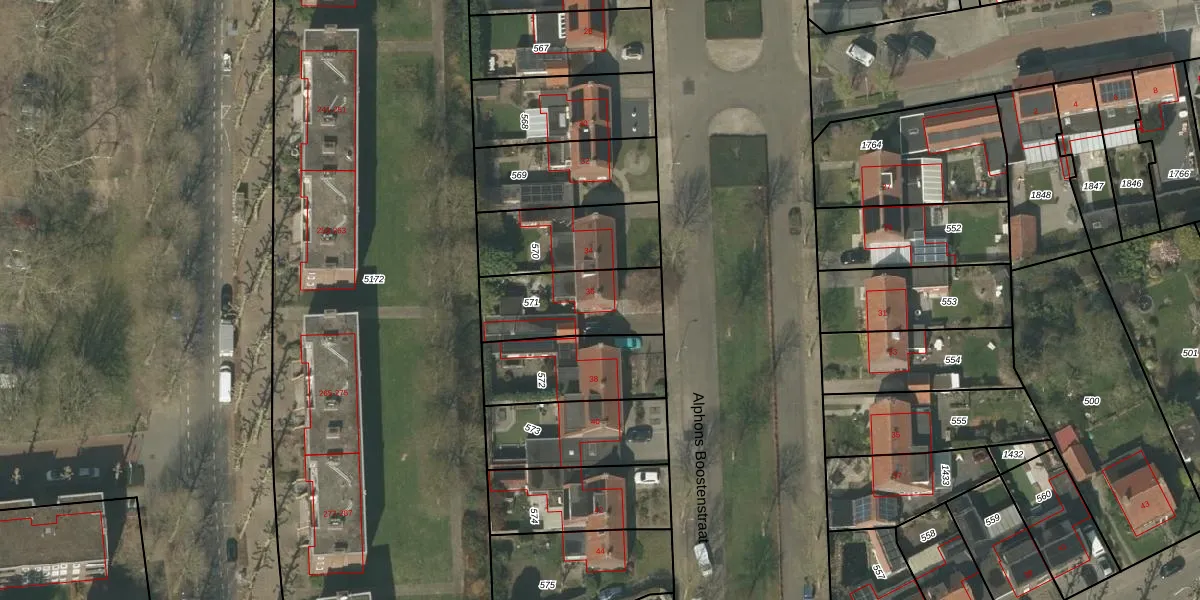 Het perceel waarop Alphons Boostenstraat 36 staat heeft een oppervlakte van 323 m². Dit is een groot perceel. De perceeloppervlakte wordt geregistreerd door het Kadaster. Gedetailleerde informatie over de maten van dit perceel kunt u vinden in het rapport Kadastrale kaart met maatvoering van Alphons Boostenstraat 36.