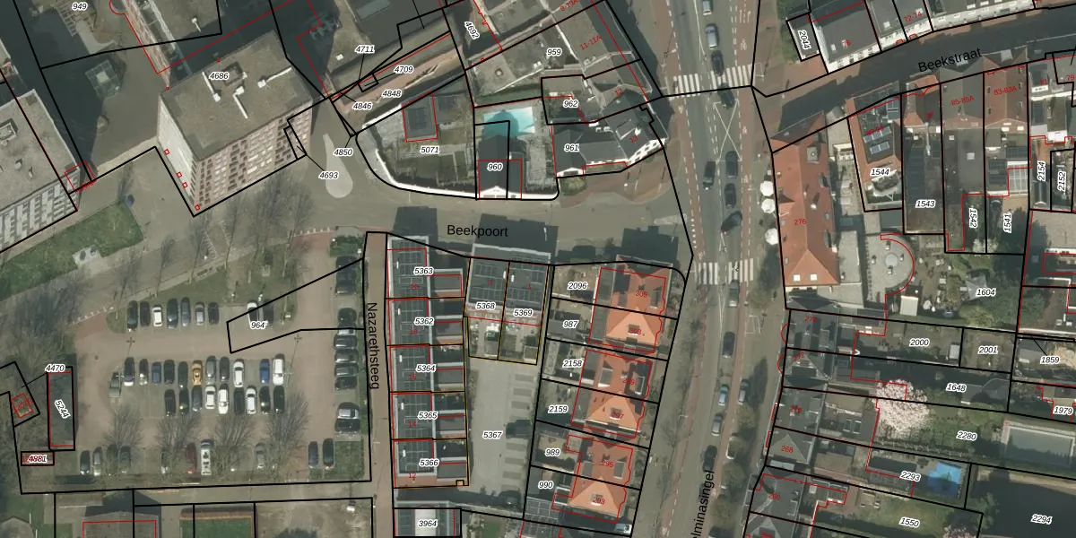 Gebruik de zoekbalk of klik op een perceel voor informatie over de adressen binnen dit perceel.