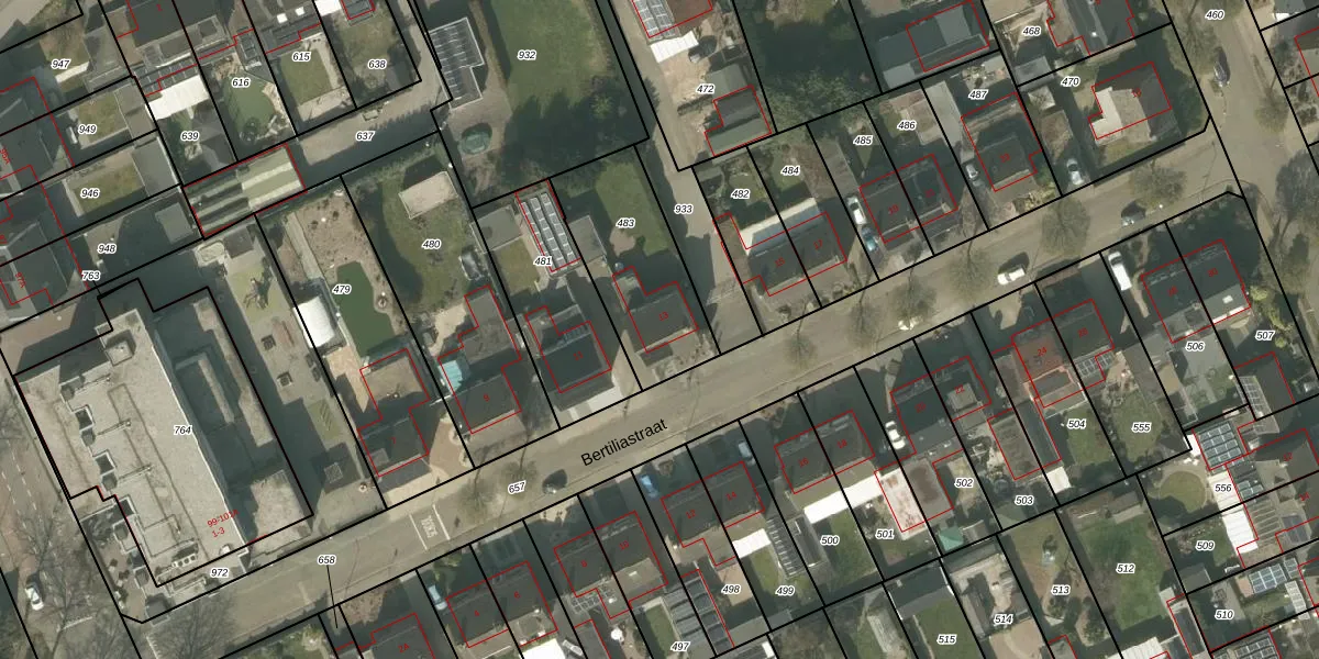 Het perceel waarop Bertiliastraat 13 staat heeft een oppervlakte van 476 m². Dit is een groot perceel. De perceeloppervlakte wordt geregistreerd door het Kadaster. Gedetailleerde informatie over de maten van dit perceel kunt u vinden in het rapport Kadastrale kaart met maatvoering van Bertiliastraat 13.