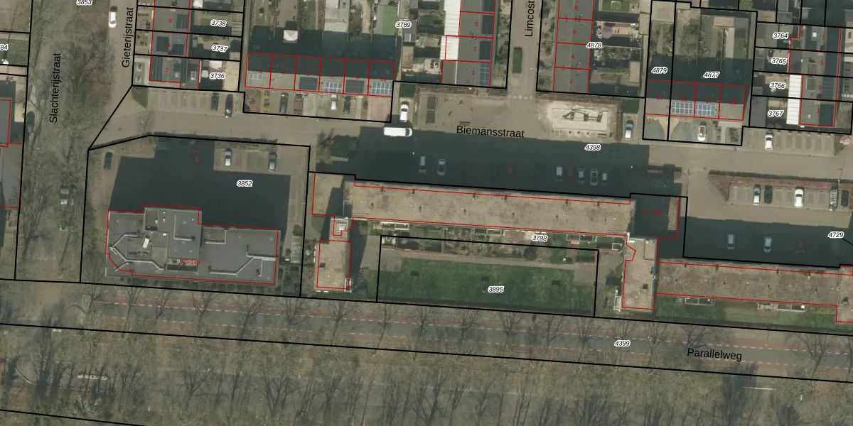 Het perceel waarop Biemansstraat 110 staat heeft een oppervlakte van 2495 m². Dit is een zeer groot perceel. De perceeloppervlakte wordt geregistreerd door het Kadaster. Gedetailleerde informatie over de maten van dit perceel kunt u vinden in het rapport Kadastrale kaart met maatvoering van Biemansstraat 110.