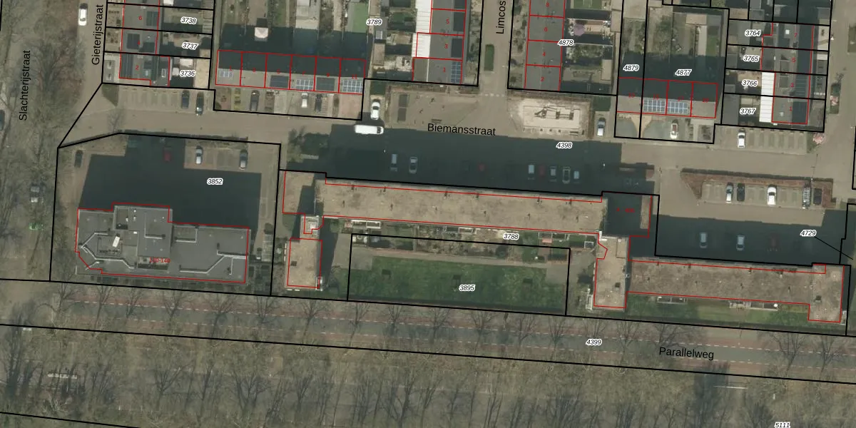 Het perceel waarop Biemansstraat 118 staat heeft een oppervlakte van 2495 m². Dit is een zeer groot perceel. De perceeloppervlakte wordt geregistreerd door het Kadaster. Gedetailleerde informatie over de maten van dit perceel kunt u vinden in het rapport Kadastrale kaart met maatvoering van Biemansstraat 118.