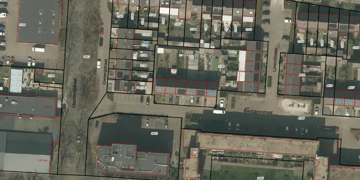 Het perceel waarop Biemansstraat 5 staat heeft een oppervlakte van 1937 m². Dit is een zeer groot perceel. De perceeloppervlakte wordt geregistreerd door het Kadaster. Gedetailleerde informatie over de maten van dit perceel kunt u vinden in het rapport Kadastrale kaart met maatvoering van Biemansstraat 5.