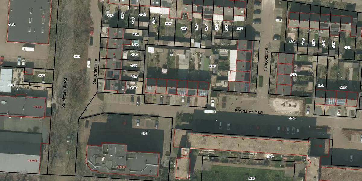 Het perceel waarop Biemansstraat 7 staat heeft een oppervlakte van 1937 m². Dit is een zeer groot perceel. De perceeloppervlakte wordt geregistreerd door het Kadaster. Gedetailleerde informatie over de maten van dit perceel kunt u vinden in het rapport Kadastrale kaart met maatvoering van Biemansstraat 7.