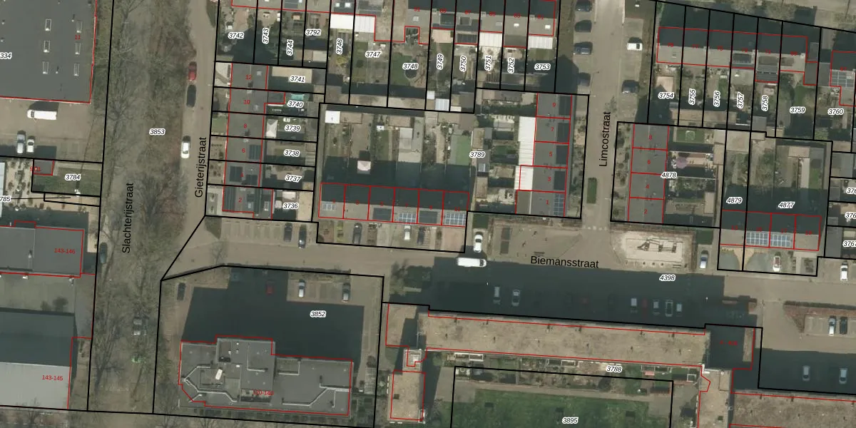 Het perceel waarop Biemansstraat 9 staat heeft een oppervlakte van 1937 m². Dit is een zeer groot perceel. De perceeloppervlakte wordt geregistreerd door het Kadaster. Gedetailleerde informatie over de maten van dit perceel kunt u vinden in het rapport Kadastrale kaart met maatvoering van Biemansstraat 9.