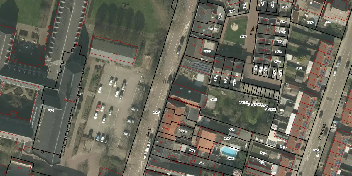 Het perceel waarop Biest 104 staat heeft een oppervlakte van 1336 m². Dit is een zeer groot perceel. De perceeloppervlakte wordt geregistreerd door het Kadaster. Gedetailleerde informatie over de maten van dit perceel kunt u vinden in het rapport Kadastrale kaart met maatvoering van Biest 104.