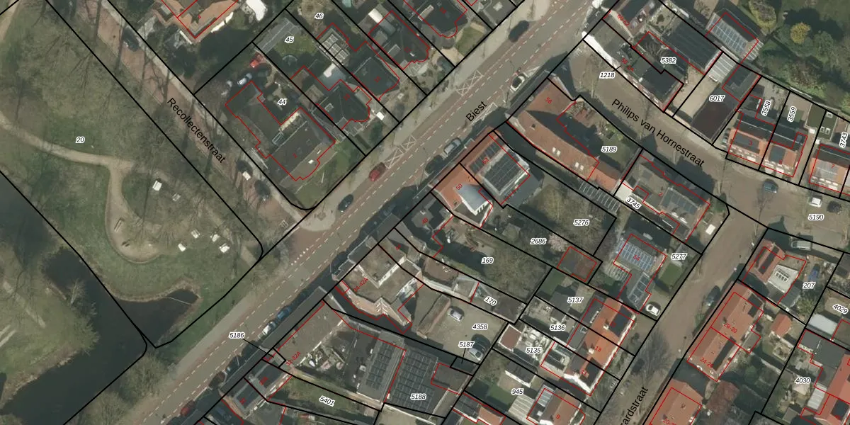 Het perceel waarop Biest 48 staat heeft een oppervlakte van 397 m². Dit is een groot perceel. De perceeloppervlakte wordt geregistreerd door het Kadaster. Gedetailleerde informatie over de maten van dit perceel kunt u vinden in het rapport Kadastrale kaart met maatvoering van Biest 48.