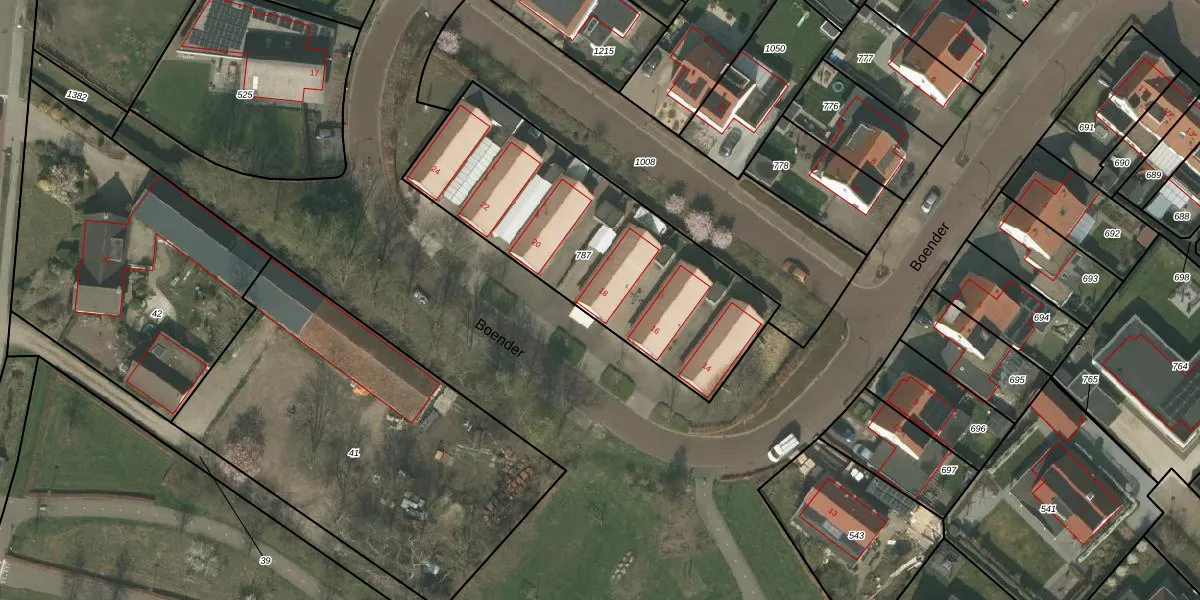 Het perceel waarop Boender 18 staat heeft een oppervlakte van 1272 m². Dit is een zeer groot perceel. De perceeloppervlakte wordt geregistreerd door het Kadaster. Gedetailleerde informatie over de maten van dit perceel kunt u vinden in het rapport Kadastrale kaart met maatvoering van Boender 18.