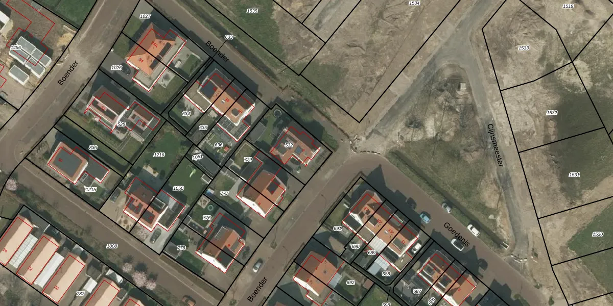 Het perceel waarop Boender 2 staat heeft een oppervlakte van 364 m². Dit is een groot perceel. De perceeloppervlakte wordt geregistreerd door het Kadaster. Gedetailleerde informatie over de maten van dit perceel kunt u vinden in het rapport Kadastrale kaart met maatvoering van Boender 2.