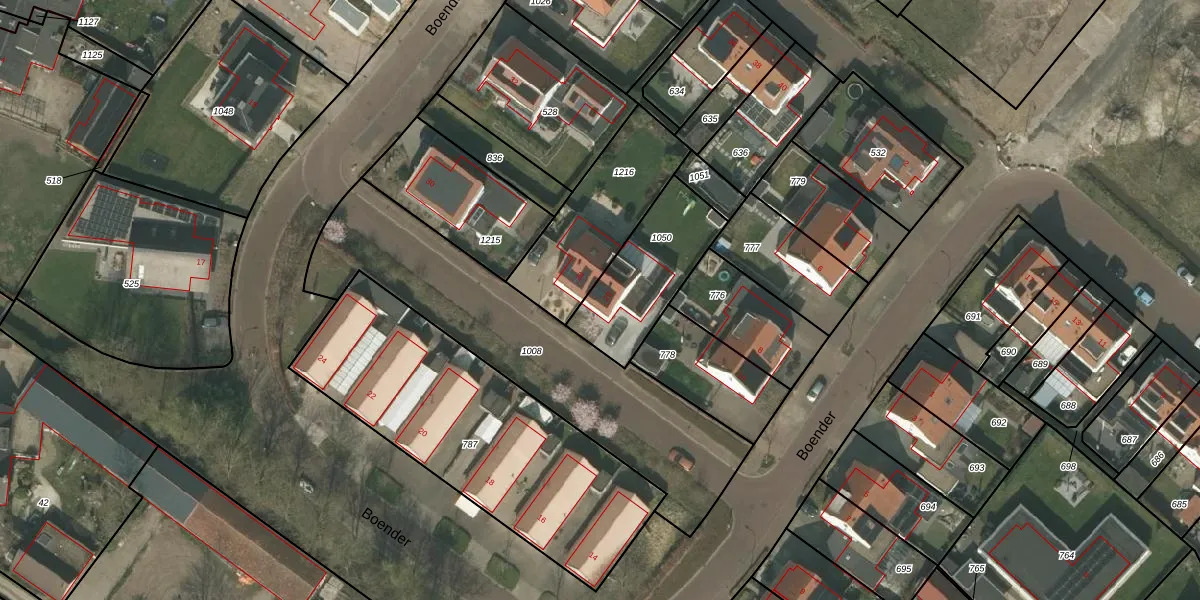 Het perceel waarop Boender 26 staat heeft een oppervlakte van 364 m². Dit is een groot perceel. De perceeloppervlakte wordt geregistreerd door het Kadaster. Gedetailleerde informatie over de maten van dit perceel kunt u vinden in het rapport Kadastrale kaart met maatvoering van Boender 26.