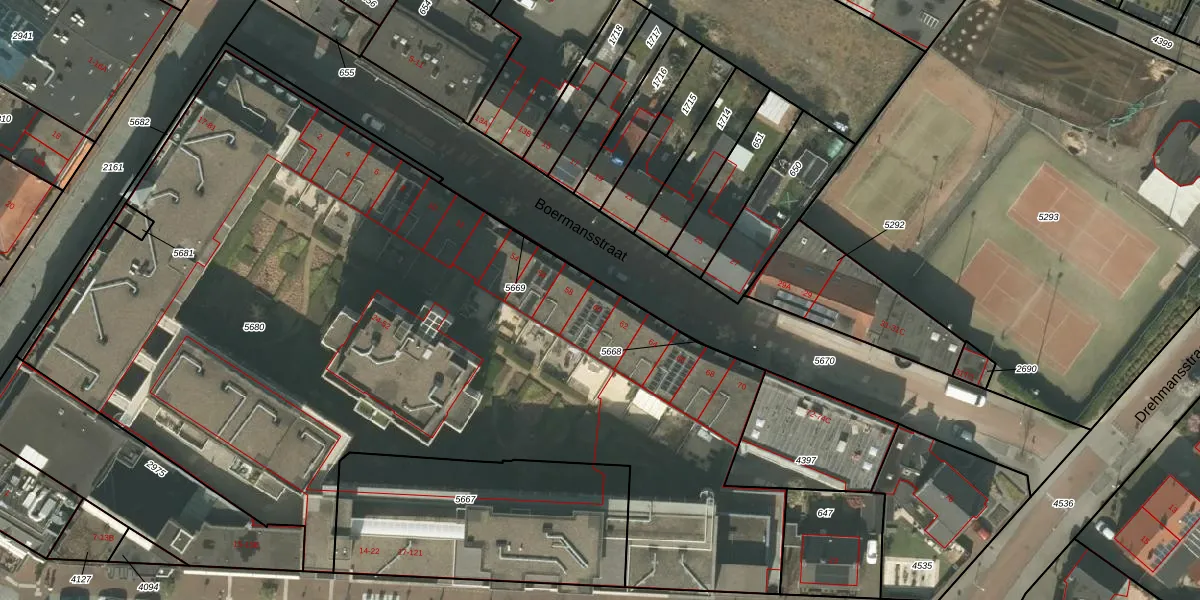 Het perceel waarop Boermansstraat 60 staat heeft een oppervlakte van 5596 m². Dit is een zeer groot perceel. De perceeloppervlakte wordt geregistreerd door het Kadaster. Gedetailleerde informatie over de maten van dit perceel kunt u vinden in het rapport Kadastrale kaart met maatvoering van Boermansstraat 60.