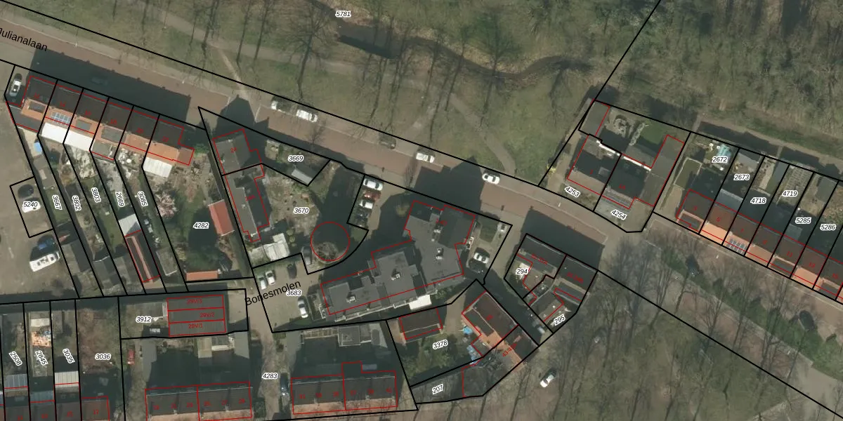Het perceel waarop Bonesmolen 19 staat heeft een oppervlakte van 1213 m². Dit is een zeer groot perceel. De perceeloppervlakte wordt geregistreerd door het Kadaster. Gedetailleerde informatie over de maten van dit perceel kunt u vinden in het rapport Kadastrale kaart met maatvoering van Bonesmolen 19.