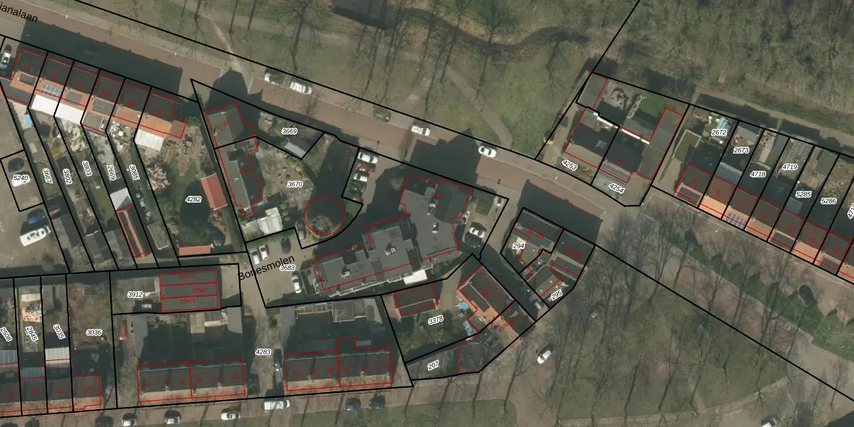 Het perceel waarop Bonesmolen 21 staat heeft een oppervlakte van 1213 m². Dit is een zeer groot perceel. De perceeloppervlakte wordt geregistreerd door het Kadaster. Gedetailleerde informatie over de maten van dit perceel kunt u vinden in het rapport Kadastrale kaart met maatvoering van Bonesmolen 21.