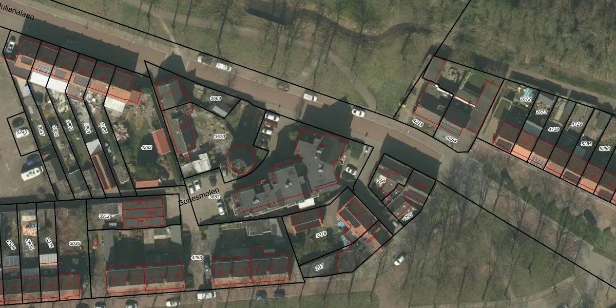 Het perceel waarop Bonesmolen 25 staat heeft een oppervlakte van 1213 m². Dit is een zeer groot perceel. De perceeloppervlakte wordt geregistreerd door het Kadaster. Gedetailleerde informatie over de maten van dit perceel kunt u vinden in het rapport Kadastrale kaart met maatvoering van Bonesmolen 25.