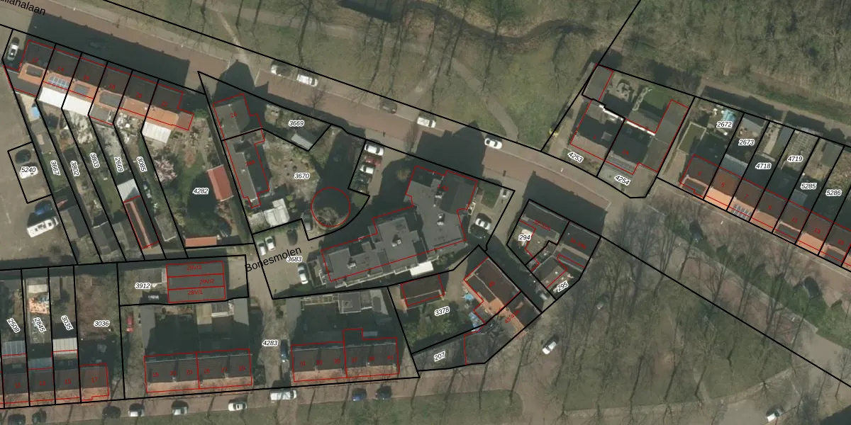 Het perceel waarop Bonesmolen 33 staat heeft een oppervlakte van 1213 m². Dit is een zeer groot perceel. De perceeloppervlakte wordt geregistreerd door het Kadaster. Gedetailleerde informatie over de maten van dit perceel kunt u vinden in het rapport Kadastrale kaart met maatvoering van Bonesmolen 33.