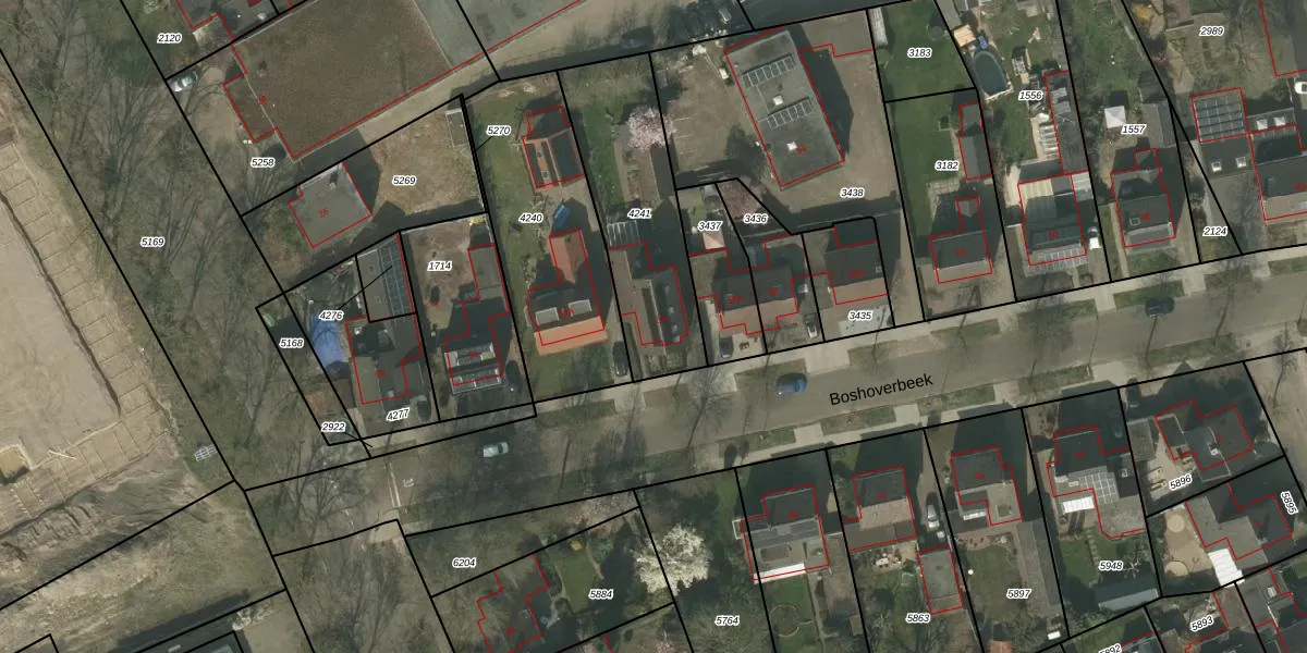 Het perceel waarop Boshoverbeek 58 staat heeft een oppervlakte van 625 m². Dit is een groot perceel. De perceeloppervlakte wordt geregistreerd door het Kadaster. Gedetailleerde informatie over de maten van dit perceel kunt u vinden in het rapport Kadastrale kaart met maatvoering van Boshoverbeek 58.