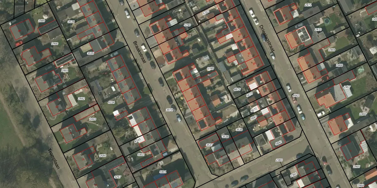 Het perceel waarop Braakstraat 8 staat heeft een oppervlakte van 2434 m². Dit is een zeer groot perceel. De perceeloppervlakte wordt geregistreerd door het Kadaster. Gedetailleerde informatie over de maten van dit perceel kunt u vinden in het rapport Kadastrale kaart met maatvoering van Braakstraat 8.