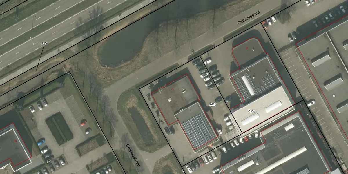 Het perceel waarop Celsiusstraat 17 staat heeft een oppervlakte van 2040 m². Dit is een zeer groot perceel. De perceeloppervlakte wordt geregistreerd door het Kadaster. Gedetailleerde informatie over de maten van dit perceel kunt u vinden in het rapport Kadastrale kaart met maatvoering van Celsiusstraat 17.