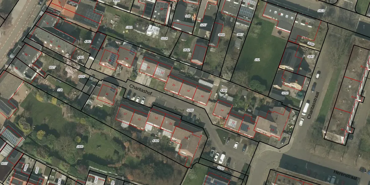 Het perceel waarop Charitashof 18 staat heeft een oppervlakte van 2410 m². Dit is een zeer groot perceel. De perceeloppervlakte wordt geregistreerd door het Kadaster. Gedetailleerde informatie over de maten van dit perceel kunt u vinden in het rapport Kadastrale kaart met maatvoering van Charitashof 18.
