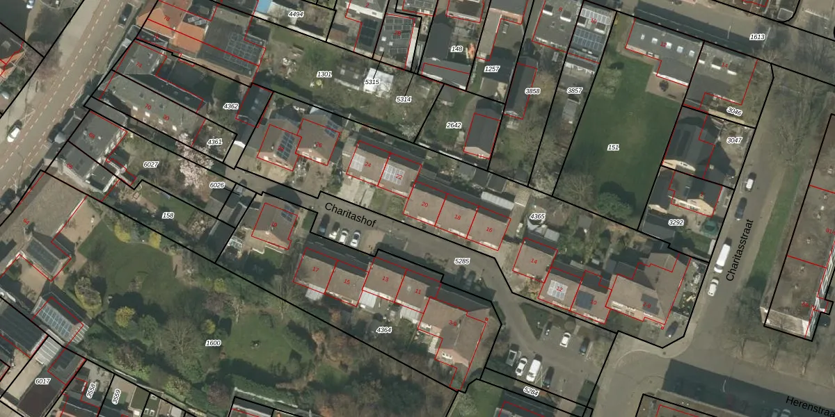 Het perceel waarop Charitashof 20 staat heeft een oppervlakte van 2410 m². Dit is een zeer groot perceel. De perceeloppervlakte wordt geregistreerd door het Kadaster. Gedetailleerde informatie over de maten van dit perceel kunt u vinden in het rapport Kadastrale kaart met maatvoering van Charitashof 20.