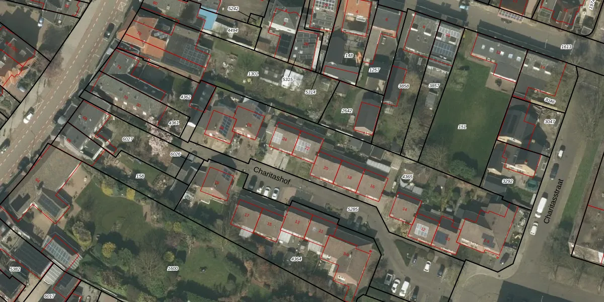 Het perceel waarop Charitashof 22 staat heeft een oppervlakte van 2410 m². Dit is een zeer groot perceel. De perceeloppervlakte wordt geregistreerd door het Kadaster. Gedetailleerde informatie over de maten van dit perceel kunt u vinden in het rapport Kadastrale kaart met maatvoering van Charitashof 22.
