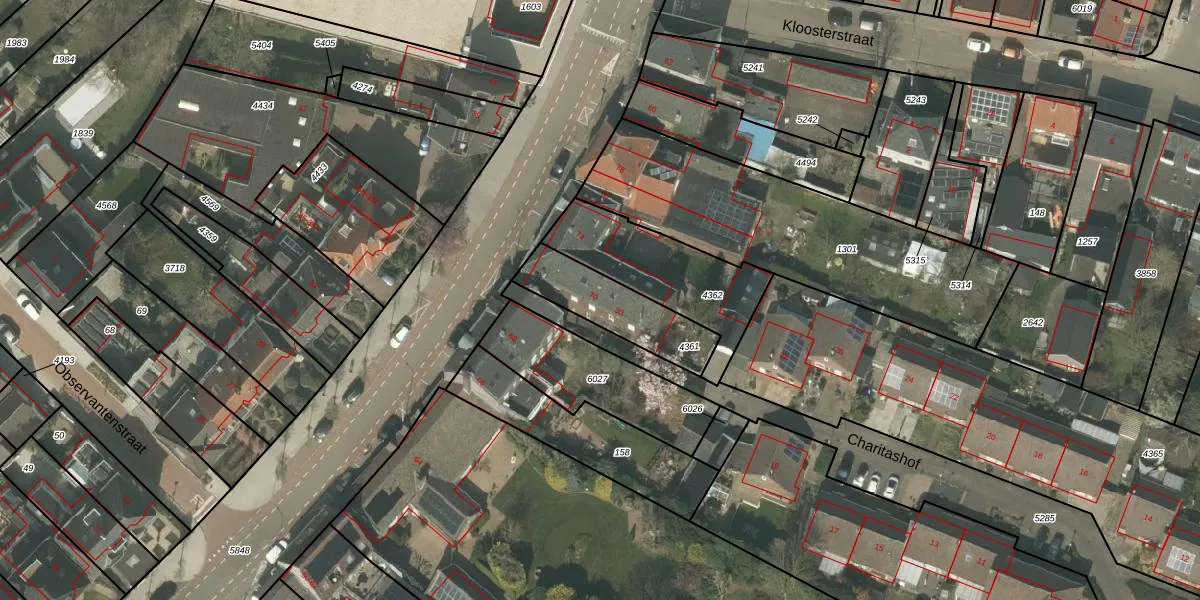 Het perceel waarop Charitashof 30 staat heeft een oppervlakte van 273 m². Dit is een middelgroot perceel. De perceeloppervlakte wordt geregistreerd door het Kadaster. Gedetailleerde informatie over de maten van dit perceel kunt u vinden in het rapport Kadastrale kaart met maatvoering van Charitashof 30.