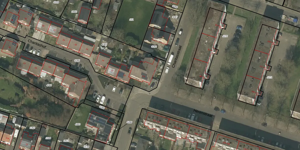Het perceel waarop Charitashof 6 staat heeft een oppervlakte van 2410 m². Dit is een zeer groot perceel. De perceeloppervlakte wordt geregistreerd door het Kadaster. Gedetailleerde informatie over de maten van dit perceel kunt u vinden in het rapport Kadastrale kaart met maatvoering van Charitashof 6.