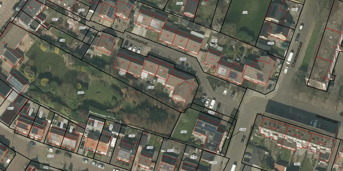 Het perceel waarop Charitashof 9 staat heeft een oppervlakte van 1380 m². Dit is een zeer groot perceel. De perceeloppervlakte wordt geregistreerd door het Kadaster. Gedetailleerde informatie over de maten van dit perceel kunt u vinden in het rapport Kadastrale kaart met maatvoering van Charitashof 9.