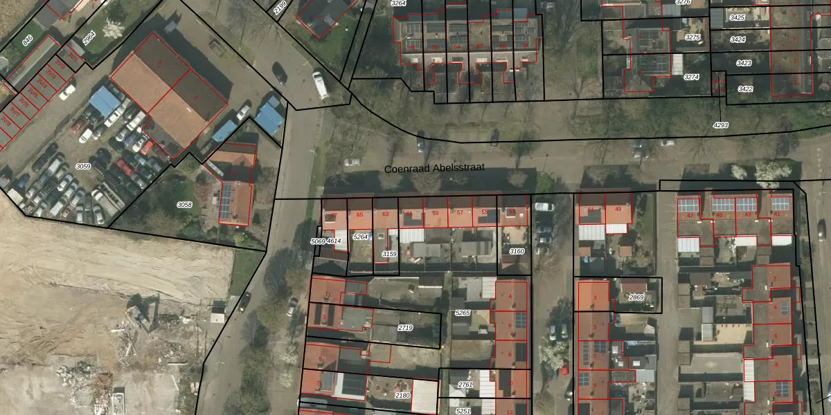 Het perceel waarop Coenraad Abelsstraat 61 staat heeft een oppervlakte van 1479 m². Dit is een zeer groot perceel. De perceeloppervlakte wordt geregistreerd door het Kadaster. Gedetailleerde informatie over de maten van dit perceel kunt u vinden in het rapport Kadastrale kaart met maatvoering van Coenraad Abelsstraat 61.