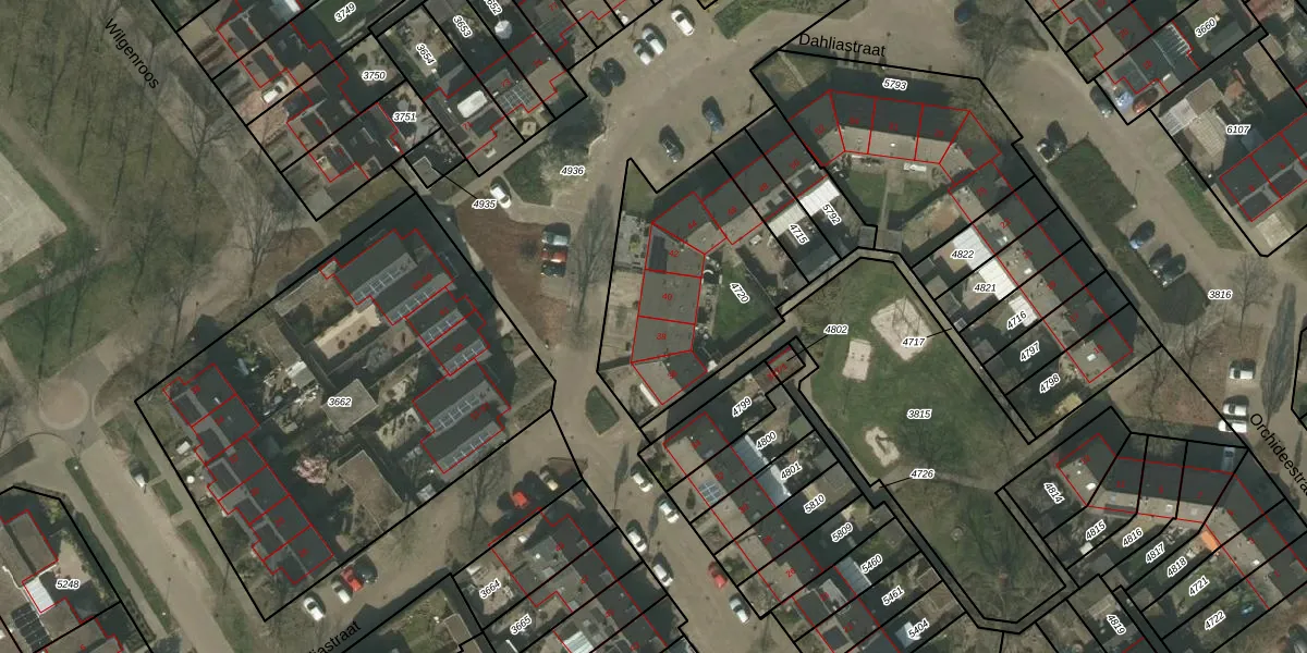 Het perceel waarop Dahliastraat 38 staat heeft een oppervlakte van 815 m². Dit is een groot perceel. De perceeloppervlakte wordt geregistreerd door het Kadaster. Gedetailleerde informatie over de maten van dit perceel kunt u vinden in het rapport Kadastrale kaart met maatvoering van Dahliastraat 38.