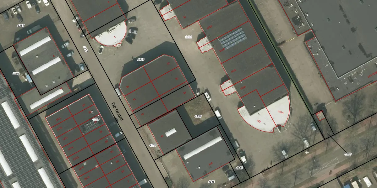 Het perceel waarop De Noord 33 staat heeft een oppervlakte van 1,3 ha. Dit is een zeer groot perceel. De perceeloppervlakte wordt geregistreerd door het Kadaster. Gedetailleerde informatie over de maten van dit perceel kunt u vinden in het rapport Kadastrale kaart met maatvoering van De Noord 33.