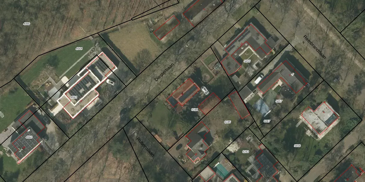 Het perceel waarop Diesterbaan 25 staat heeft een oppervlakte van 1380 m². Dit is een zeer groot perceel. De perceeloppervlakte wordt geregistreerd door het Kadaster. Gedetailleerde informatie over de maten van dit perceel kunt u vinden in het rapport Kadastrale kaart met maatvoering van Diesterbaan 25.