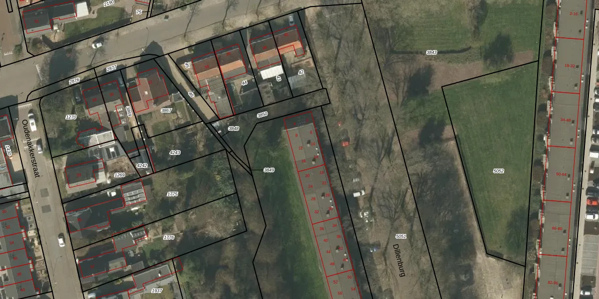 Het perceel waarop Dillenburg 12 staat heeft een oppervlakte van 4435 m². Dit is een zeer groot perceel. De perceeloppervlakte wordt geregistreerd door het Kadaster. Gedetailleerde informatie over de maten van dit perceel kunt u vinden in het rapport Kadastrale kaart met maatvoering van Dillenburg 12.