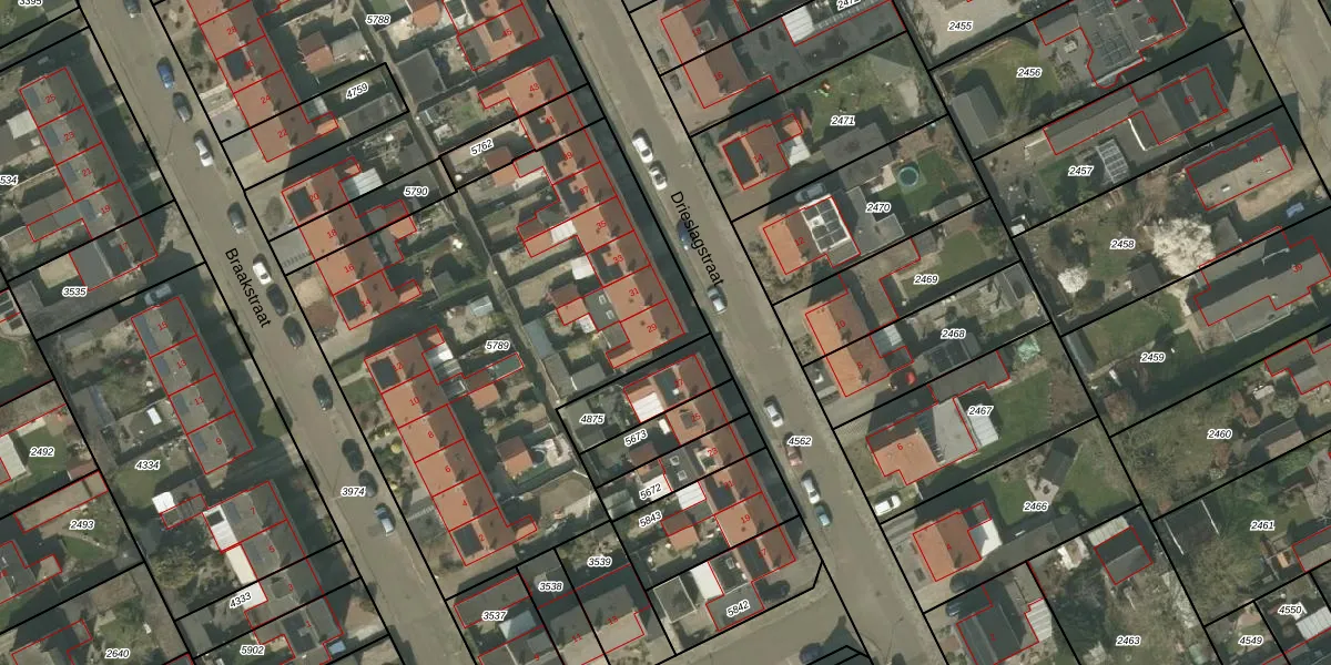 Het perceel waarop Drieslagstraat 29 staat heeft een oppervlakte van 2434 m². Dit is een zeer groot perceel. De perceeloppervlakte wordt geregistreerd door het Kadaster. Gedetailleerde informatie over de maten van dit perceel kunt u vinden in het rapport Kadastrale kaart met maatvoering van Drieslagstraat 29.