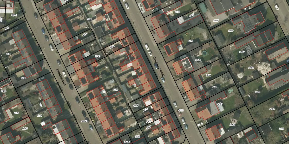 Het perceel waarop Drieslagstraat 33 staat heeft een oppervlakte van 2434 m². Dit is een zeer groot perceel. De perceeloppervlakte wordt geregistreerd door het Kadaster. Gedetailleerde informatie over de maten van dit perceel kunt u vinden in het rapport Kadastrale kaart met maatvoering van Drieslagstraat 33.