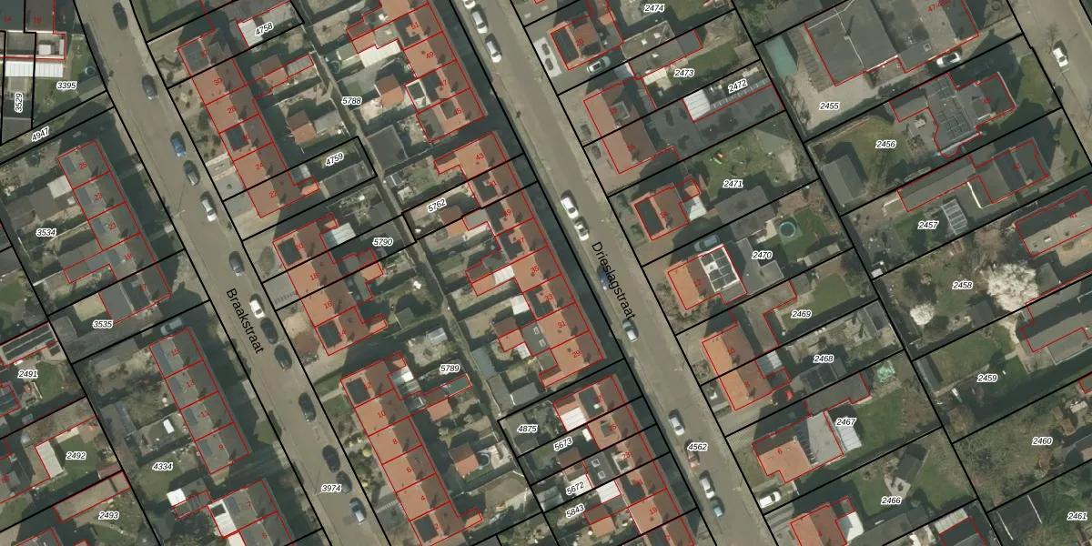 Het perceel waarop Drieslagstraat 35 staat heeft een oppervlakte van 2434 m². Dit is een zeer groot perceel. De perceeloppervlakte wordt geregistreerd door het Kadaster. Gedetailleerde informatie over de maten van dit perceel kunt u vinden in het rapport Kadastrale kaart met maatvoering van Drieslagstraat 35.
