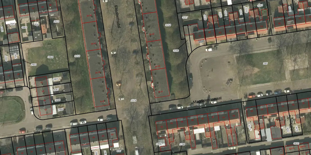 Het perceel waarop Elisabethsdal 18 staat heeft een oppervlakte van 2151 m². Dit is een zeer groot perceel. De perceeloppervlakte wordt geregistreerd door het Kadaster. Gedetailleerde informatie over de maten van dit perceel kunt u vinden in het rapport Kadastrale kaart met maatvoering van Elisabethsdal 18.