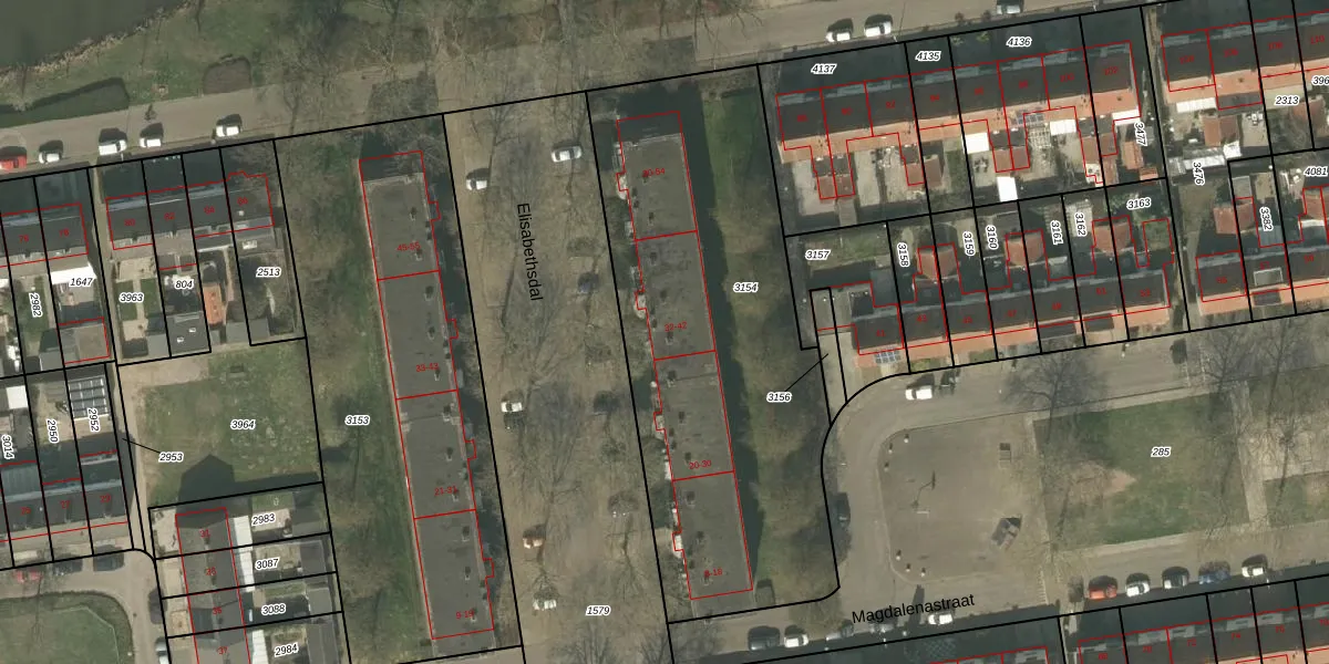 Het perceel waarop Elisabethsdal 32 staat heeft een oppervlakte van 2151 m². Dit is een zeer groot perceel. De perceeloppervlakte wordt geregistreerd door het Kadaster. Gedetailleerde informatie over de maten van dit perceel kunt u vinden in het rapport Kadastrale kaart met maatvoering van Elisabethsdal 32.