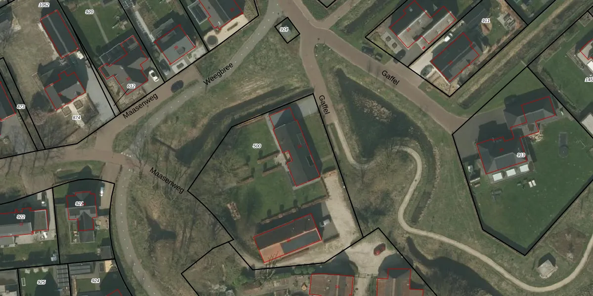 Gaffel 14 is gelegen op kadastraal perceel WEE01W500. Deze kadastrale aanduiding is uniek en wordt gebruikt door het Kadaster om eigendomsrechten en andere zakelijke rechten vast te leggen. Het perceel maakt onderdeel uit van de kadastrale gemeente Weert.