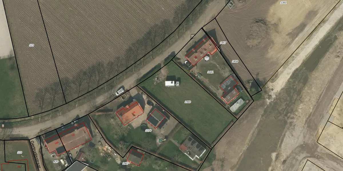 Het perceel waarop Gertrudisstraat 16-A staat heeft een oppervlakte van 1300 m². Dit is een zeer groot perceel. De perceeloppervlakte wordt geregistreerd door het Kadaster. Gedetailleerde informatie over de maten van dit perceel kunt u vinden in het rapport Kadastrale kaart met maatvoering van Gertrudisstraat 16-A.