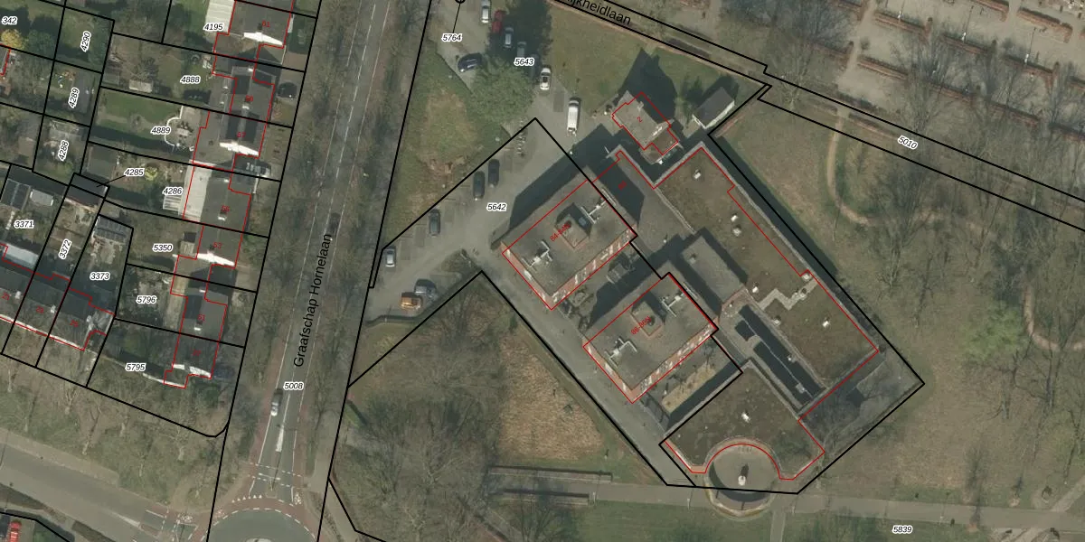 Graafschap Hornelaan 84-B is gelegen op kadastraal perceel WEE01S5642. Deze kadastrale aanduiding is uniek en wordt gebruikt door het Kadaster om eigendomsrechten en andere zakelijke rechten vast te leggen. Het perceel maakt onderdeel uit van de kadastrale gemeente Weert.