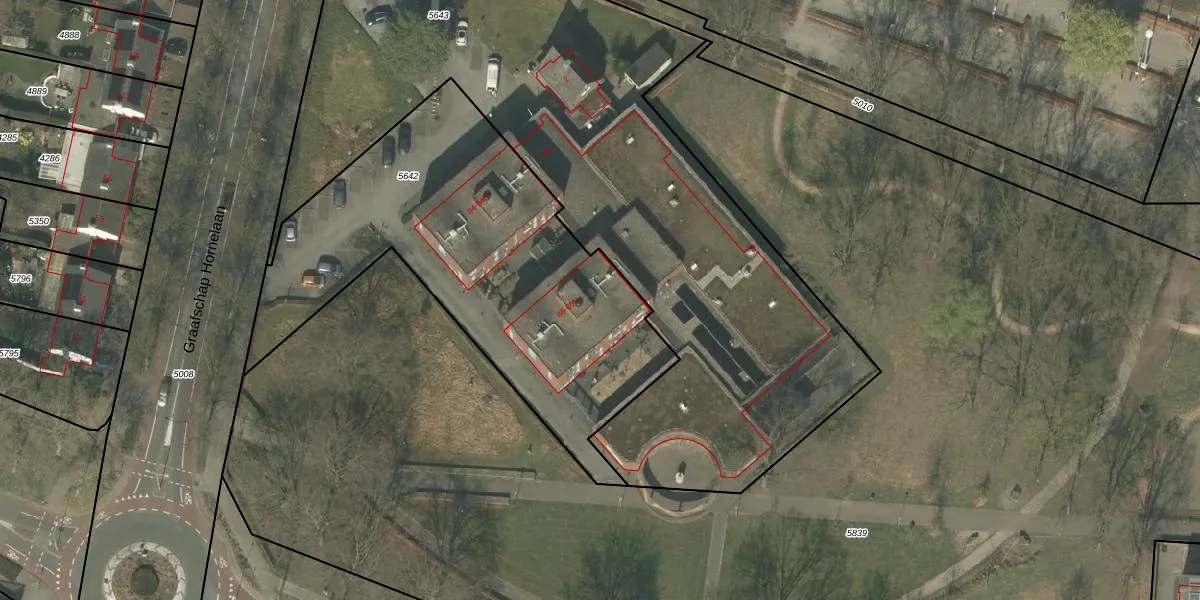 Graafschap Hornelaan 86-F is gelegen op kadastraal perceel WEE01S5642. Deze kadastrale aanduiding is uniek en wordt gebruikt door het Kadaster om eigendomsrechten en andere zakelijke rechten vast te leggen. Het perceel maakt onderdeel uit van de kadastrale gemeente Weert.
