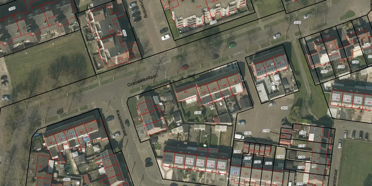 Graswinkellaan 100 is gelegen op kadastraal perceel WEE01F2765. Deze kadastrale aanduiding is uniek en wordt gebruikt door het Kadaster om eigendomsrechten en andere zakelijke rechten vast te leggen. Het perceel maakt onderdeel uit van de kadastrale gemeente Weert.