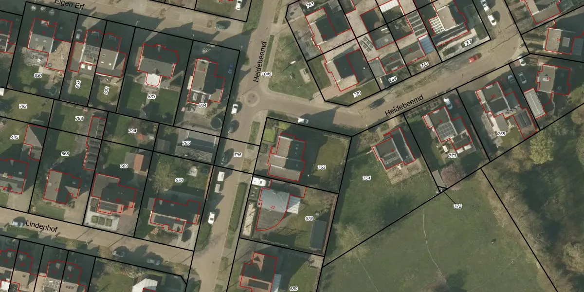 Het perceel waarop Heidebeemd 4 staat heeft een oppervlakte van 602 m². Dit is een groot perceel. De perceeloppervlakte wordt geregistreerd door het Kadaster. Gedetailleerde informatie over de maten van dit perceel kunt u vinden in het rapport Kadastrale kaart met maatvoering van Heidebeemd 4.