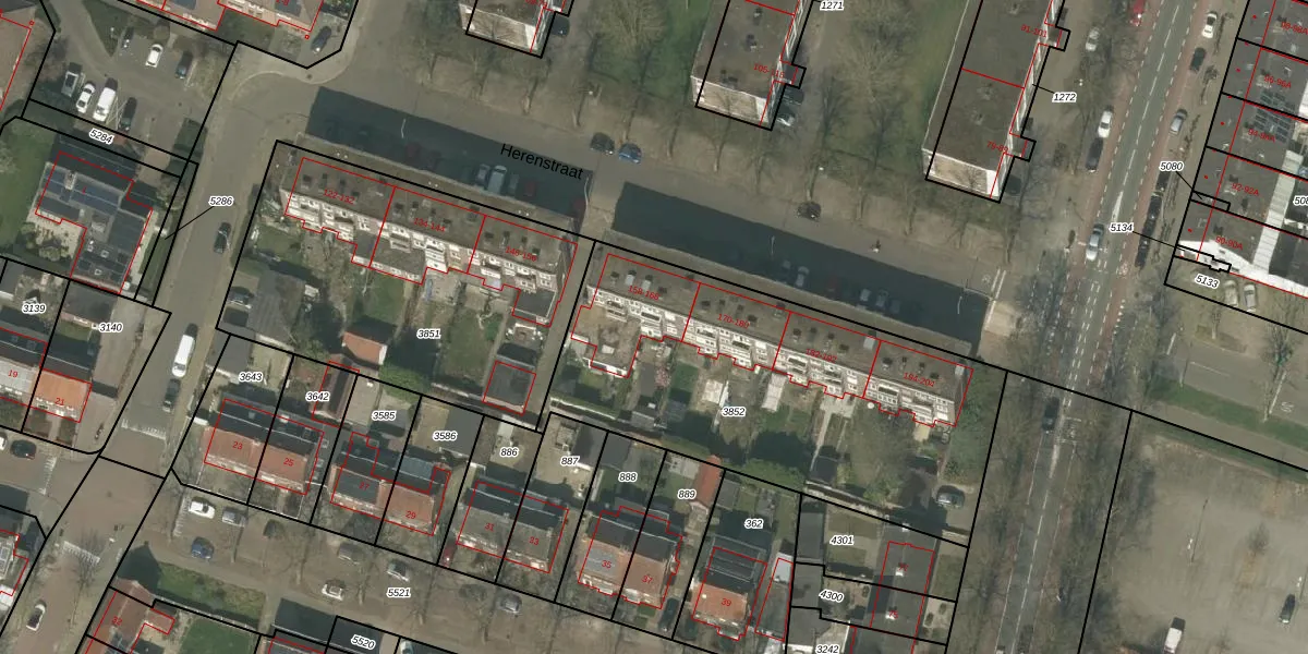 Het perceel waarop Herenstraat 168 staat heeft een oppervlakte van 1820 m². Dit is een zeer groot perceel. De perceeloppervlakte wordt geregistreerd door het Kadaster. Gedetailleerde informatie over de maten van dit perceel kunt u vinden in het rapport Kadastrale kaart met maatvoering van Herenstraat 168.