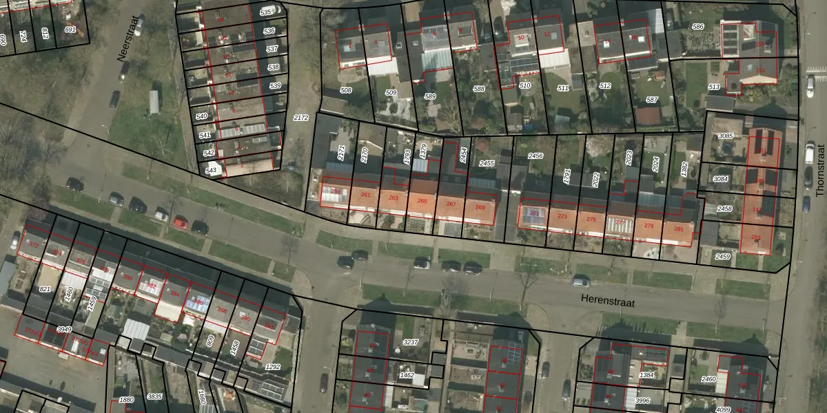 Herenstraat 265 is gelegen op kadastraal perceel WEE01T1379. Deze kadastrale aanduiding is uniek en wordt gebruikt door het Kadaster om eigendomsrechten en andere zakelijke rechten vast te leggen. Het perceel maakt onderdeel uit van de kadastrale gemeente Weert.