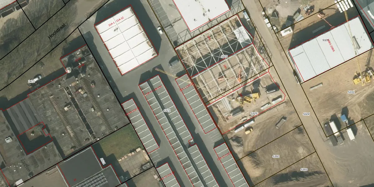 Het perceel waarop Hoolstraat 21-B-5 staat heeft een oppervlakte van 5248 m². Dit is een zeer groot perceel. De perceeloppervlakte wordt geregistreerd door het Kadaster. Gedetailleerde informatie over de maten van dit perceel kunt u vinden in het rapport Kadastrale kaart met maatvoering van Hoolstraat 21-B-5.