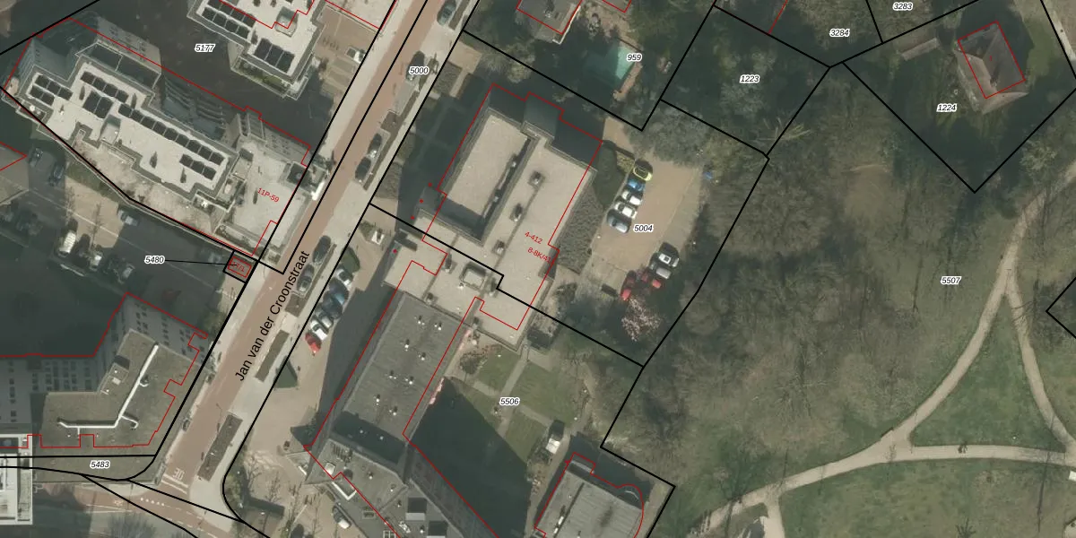 Het perceel waarop Jan van der Croonstraat 406 staat heeft een oppervlakte van 2455 m². Dit is een zeer groot perceel. De perceeloppervlakte wordt geregistreerd door het Kadaster. Gedetailleerde informatie over de maten van dit perceel kunt u vinden in het rapport Kadastrale kaart met maatvoering van Jan van der Croonstraat 406.